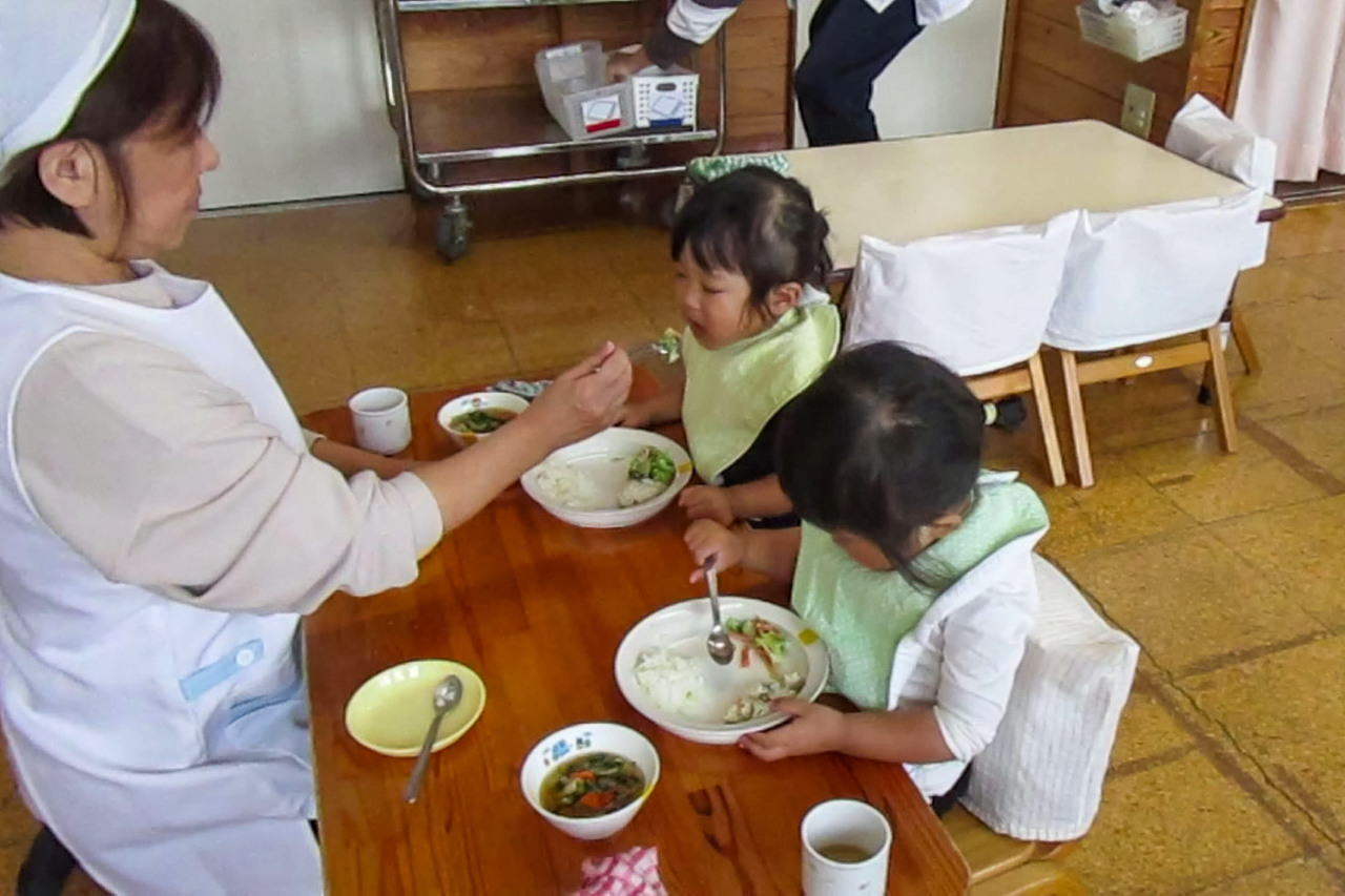はじめは1対1、座って食べるようになってからも、大人1人対2,3人の少人数で、一人ひとりとしっかり向き合い、関わりながら食べています。